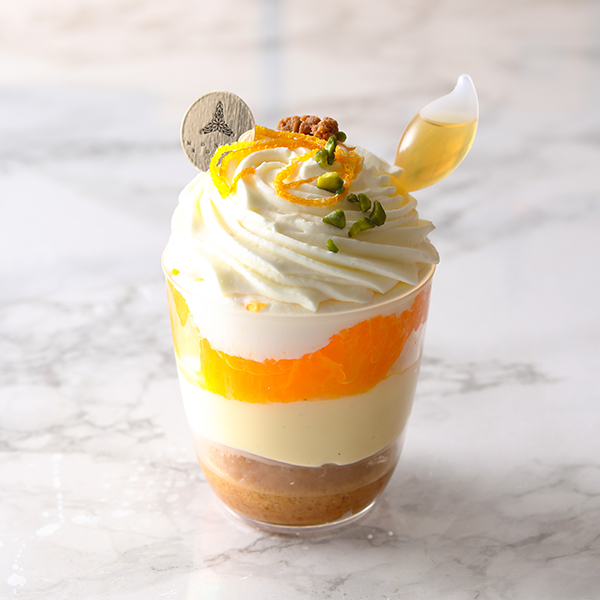 ゴロっと切り分けた桃を爽やかな桃のジュレに入れ、クリーミーな杏仁パンナコッタと層にした清涼感のあるスイーツ。